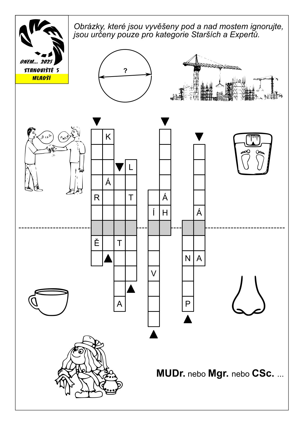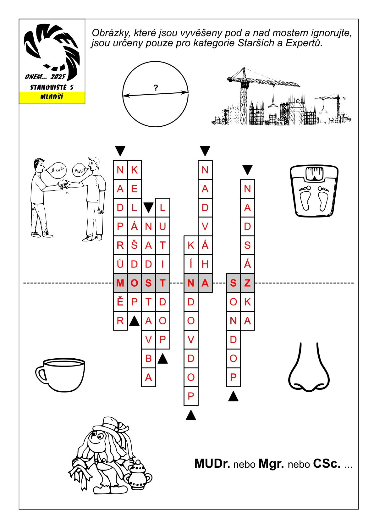 Nabízí se pojmenování obrázků vepsat do křížovky, ale délky nevychází. Je třeba použít skutečnost, že jsou slova "pod" a "nad" čárou. Ze slov na obrázcích lze pomocí předpon POD a NAD vytvořit nová existující slova. Ty vepíšeme do křížovky: slova "pod" odspoda, slova "nad" shora, pomohou vepsaná písmena.