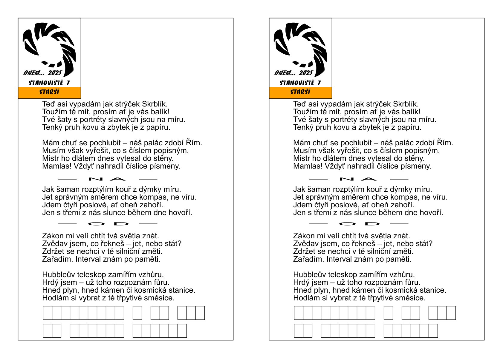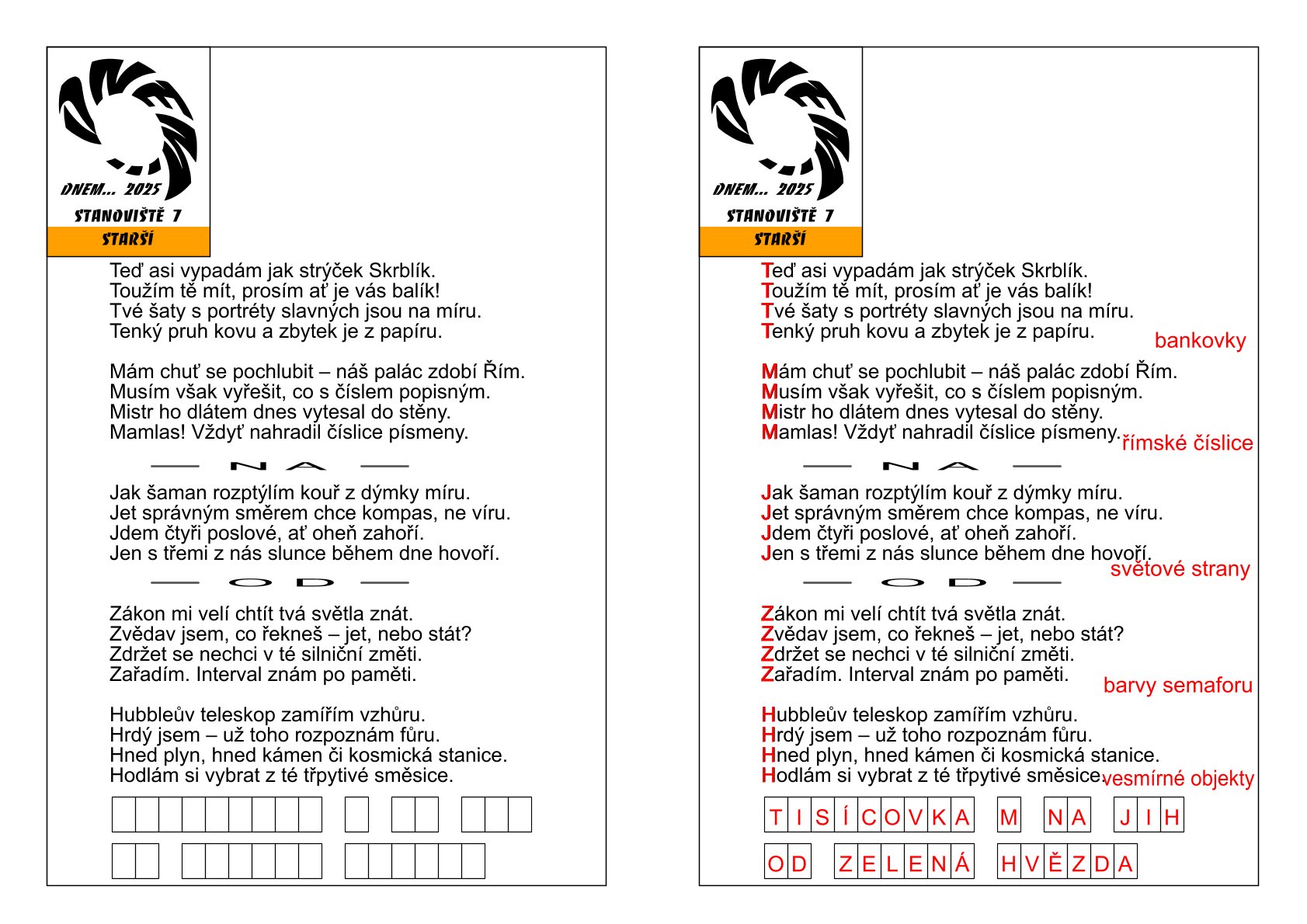 Jednotlivé sloky básně popisují vždy nějakou skupinu - bankovky, římské číslice, světové strany, barvy na semaforu, vesmírné objekty. Zároveň však všechny řádky každé sloky začínají na stejné písmeno. Najdeme tedy výraz z příslušné skupiny, který začíná na toto písmeno a přečteme tajenku (použijeme slova "na" a "od" skrytá jako oddělovače).