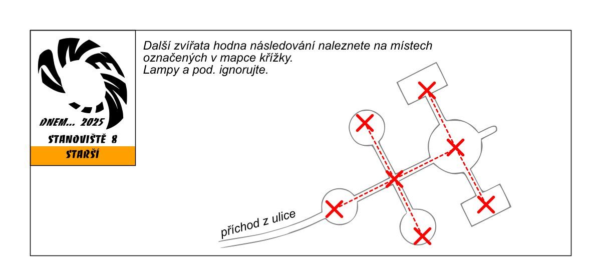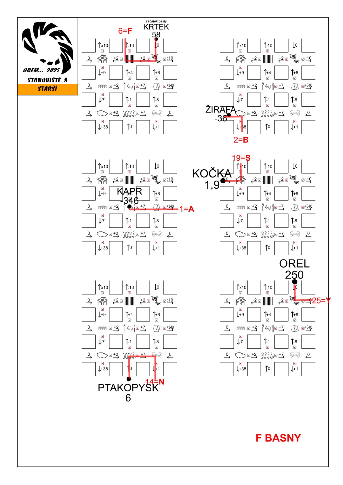 Je třeba použít znovu bludiště ze šifry 3 (k tomu navádí zvířátka i pokyn, že "Další zvířata najdeme..." i tvary schematicky podobné tvaru šifry 3). Začneme krtkem a počátečním číslem 58, pomocí operací v bludišti získáme výsledek 6, zároveň se na hřišti přesuneme stejným pohybem na další zvíře (k tomu navádí natočení jednotlivých částí a červenobílé spojnice), což je žirafa. Postupně získaná čísla převedeme na písmena (pokyn "ignoruje lampy" pomáhá v tom nevšímat si textů u východů z bludiště) a získáme takejenku "FBASNY". V mapě najdeme nedaleký památník "F.Bašný".