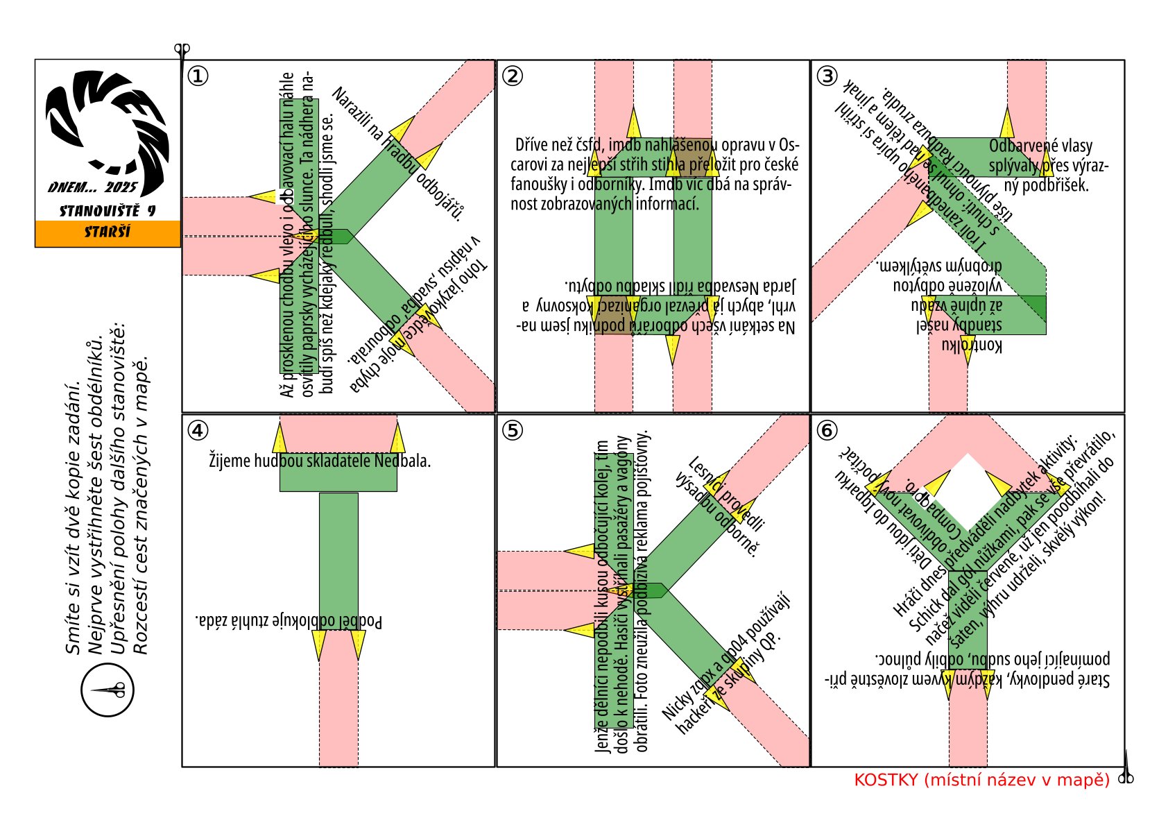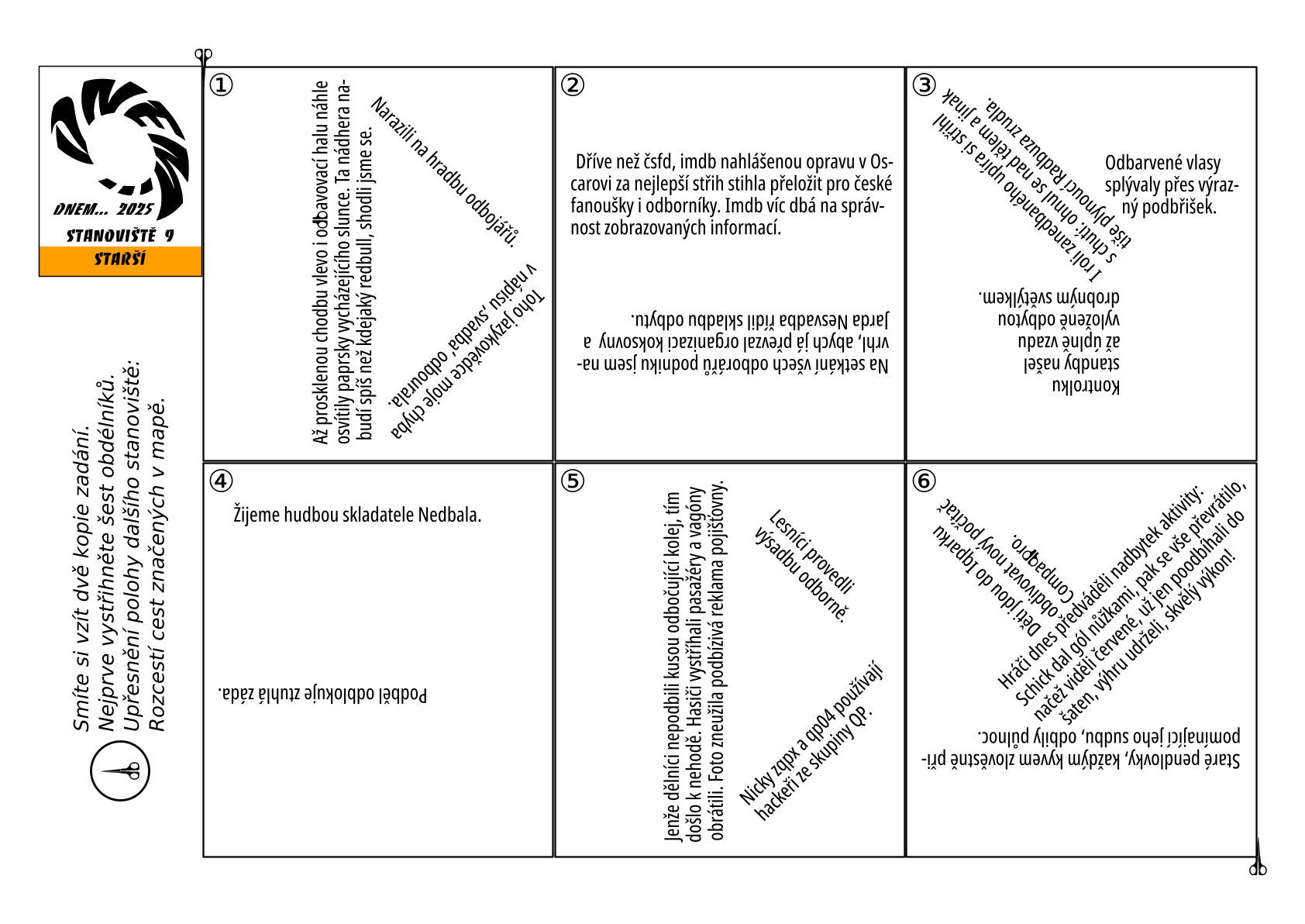 V textech se významně často vyskytují shluky písmen "db" a také nezvyklé shluky "qp". Klíčovým pozorováním je, že tyto shluky připomínají tvar nůžek ze šifry. K tomu napovídají i dva výskyty "db" a "qp" v textu, které jsou stylizované do tvaru části nůžek. Je třeba ve směru těchto "db"- a "pq"-nůžek nastřihnout jednotlivé čtverce a poté vzniklé proužky ohnout, jak to nastřihnutí dovolí. K ohnutí navádí i druhá strana, která je celá červená. Graficky vyjde tajenka KOSTKY.