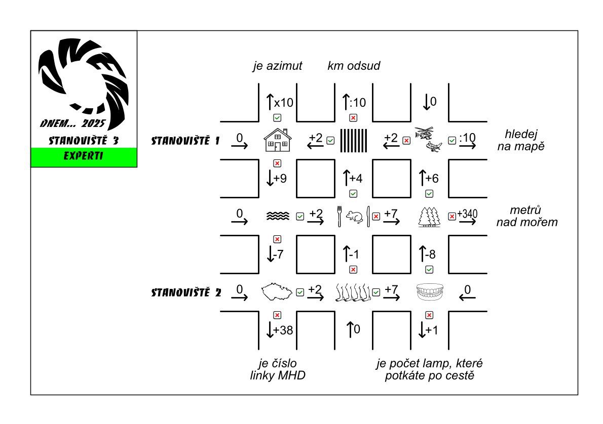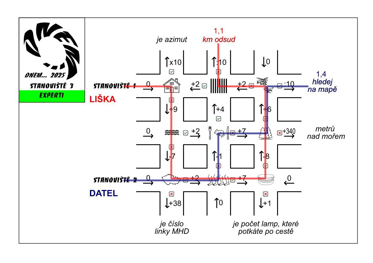 Je třeba do bludiště postupně vejít zvířátkem LIŠKA (řešení ze stanoviště č. 1) a poté DATEL (řešení ze stanoviště č. 2). Na křižovatkách se rozhodujeme podle obrázku (domácí zvíře?, má pruhy?, létá?, je vodní?, žere myši?, žije v lese?, žije (přirozeně) v Česku?, má čtyři nohy?, má zuby?. Cestou počítáme a vyjdou nám dvě části tajenky. Číslo 1,4 najdeme v mapě cca 1,1 km odsud.