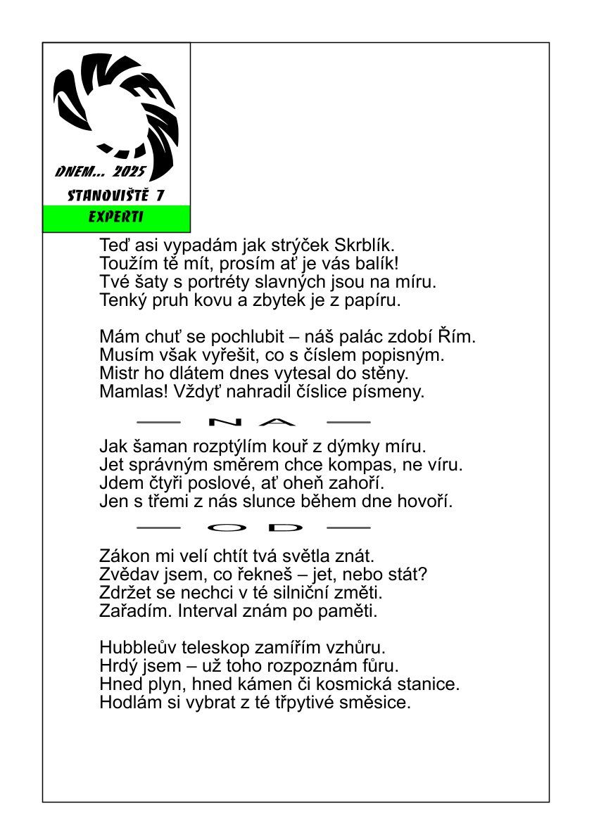 Jednotlivé sloky básně popisují vždy nějakou skupinu - bankovky, římské číslice, světové strany, barvy na semaforu, vesmírné objekty. Zároveň však všechny řádky každé sloky začínají na stejné písmeno. Najdeme tedy výraz z příslušné skupiny, který začíná na toto písmeno a přečteme tajenku (použijeme slova "na" a "od" skrytá jako oddělovače).